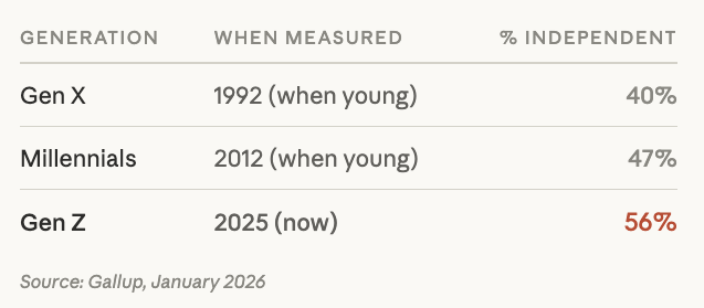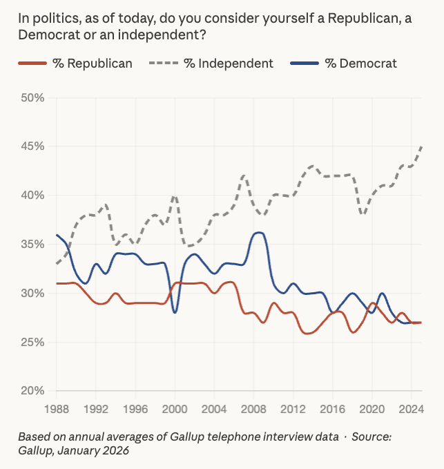 Independents have been the largest group in most years since Gallup started phone polling in 1988. What’s different now is that the floor keeps rising: the independent share rarely broke 40% before 2011, and has stayed above it ever since. The new 45% record is the latest step in a long climb. Combine that with the generational data showing each new cohort entering adulthood more independent than the last, and you’re looking at a structural shift.